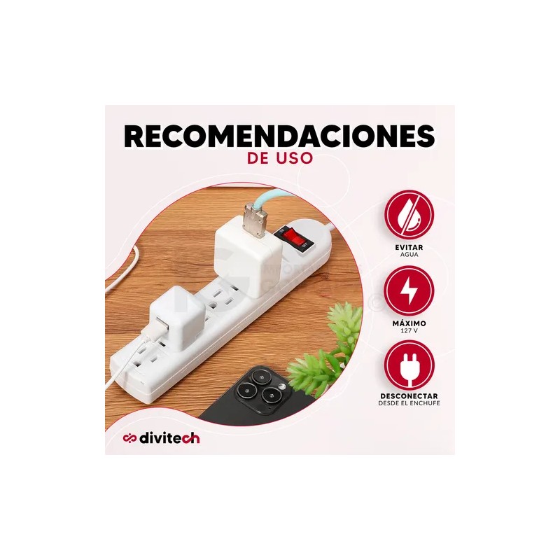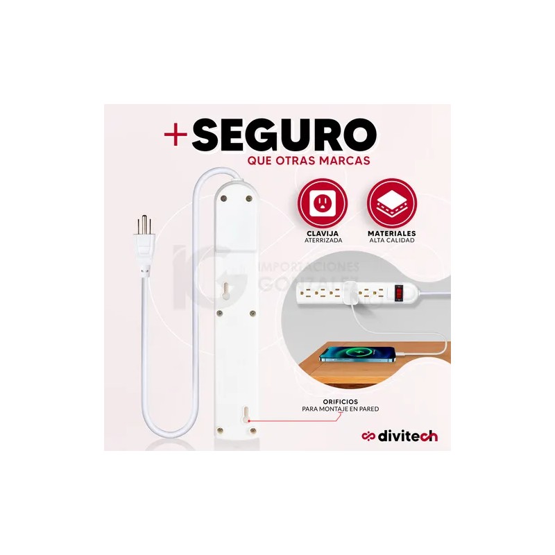 El Multicontacto Divitech® de 6 entradas con cable 100% cobre es la mejor opción si buscas durabilidad, seguridad y eficiencia. Mientras que otros productos utilizan materiales de menor calidad, nosotros te entregamos un producto superior, respaldado por nuestra experiencia como Distribuidores Oficiales de Divitech®. ¡Asegura la protección de tus dispositivos y adquiere el tuyo hoy mismo!