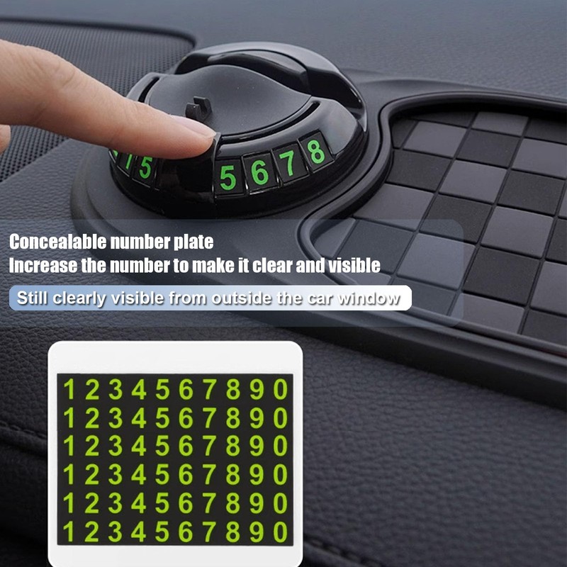 - 【Multi-Function Design】The dashboard storage pad base comes with 6 sets of temporary parking number stickers, which are convenient for displaying your contact information when you park. At the touch of a button, the hidden number plate is revealed, the numbers are enlarged to be clear and eye-catching, and can be seen at a glance out of the car window.