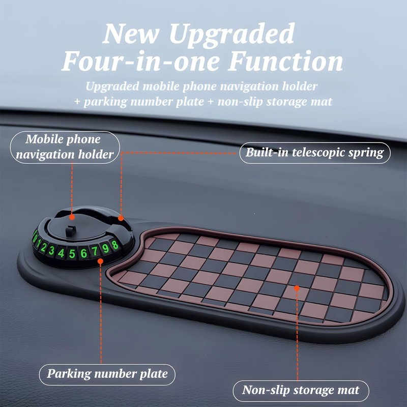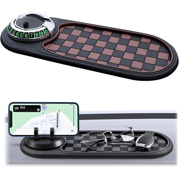 - 【Multi-Function Design】2025 Anti Skid Car Dashboard Pad comes with a phone holder that rotates 360 degrees so you can easily view your phone without blocking your driving view. The base of the mobile phone holder is equipped with 6 sets of temporary parking number stickers. You only need to rotate it to choose to hide or show it, and the number is clearly visible outside the window.
