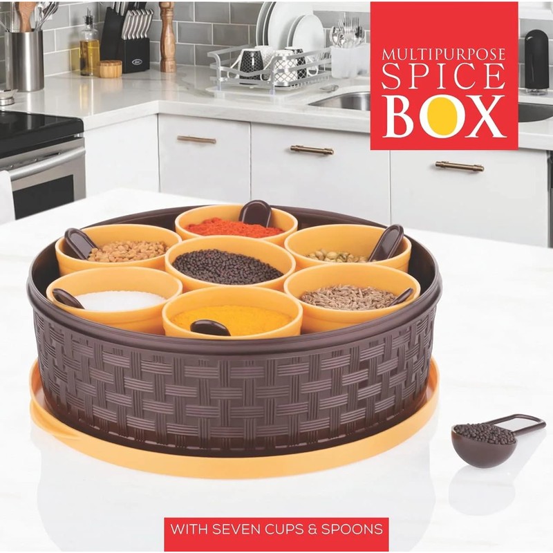 SPICE/MASALA BOX CONTAINER : This Multipurpose Spice Box made With 100% food grade BPA free Virgin material is very useful to keep spices in fresh and proper way in single box. This Round Storage box with 7 sections and 7 Spoons can be used for storing handy amount of all spices , Rangoli Colors and masalas frequently used in kitchen. It is also very useful for various other household usages like for Rangoli powder, Medicines, Tailoring Items, etc.