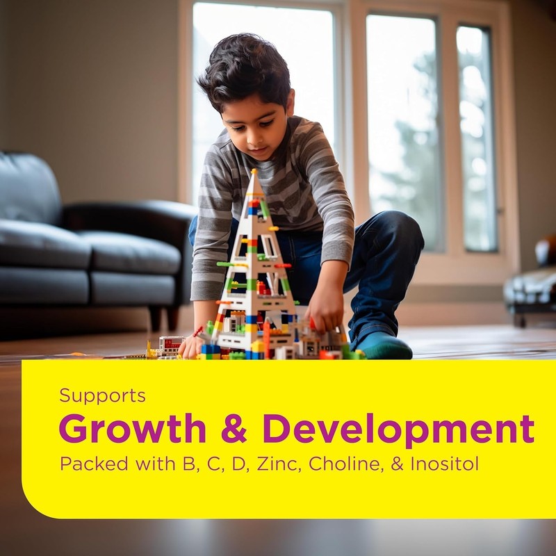 These soft, pectin-based gummies are fortified with Vitamins A, B5, B12, C, D, and E, as well as Choline, Folic Acid, Iodine, Inositol, Magnesium and Zinc. All to help support your child's daily nutritional needs while providing them with the boost they need to thrive inside and out.