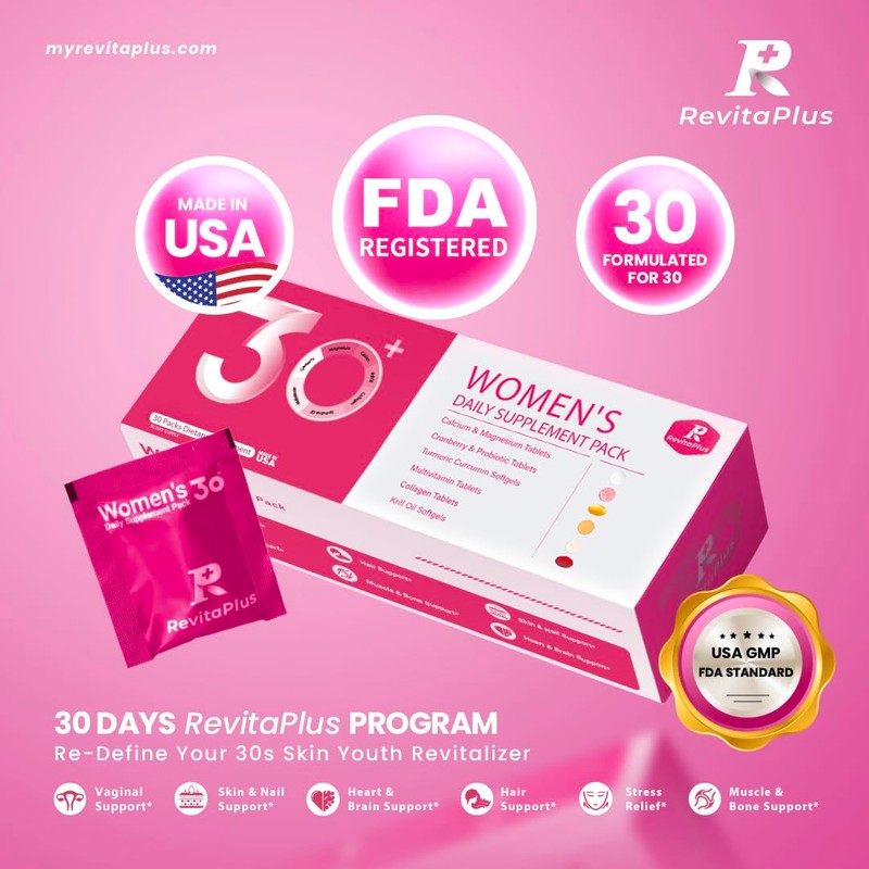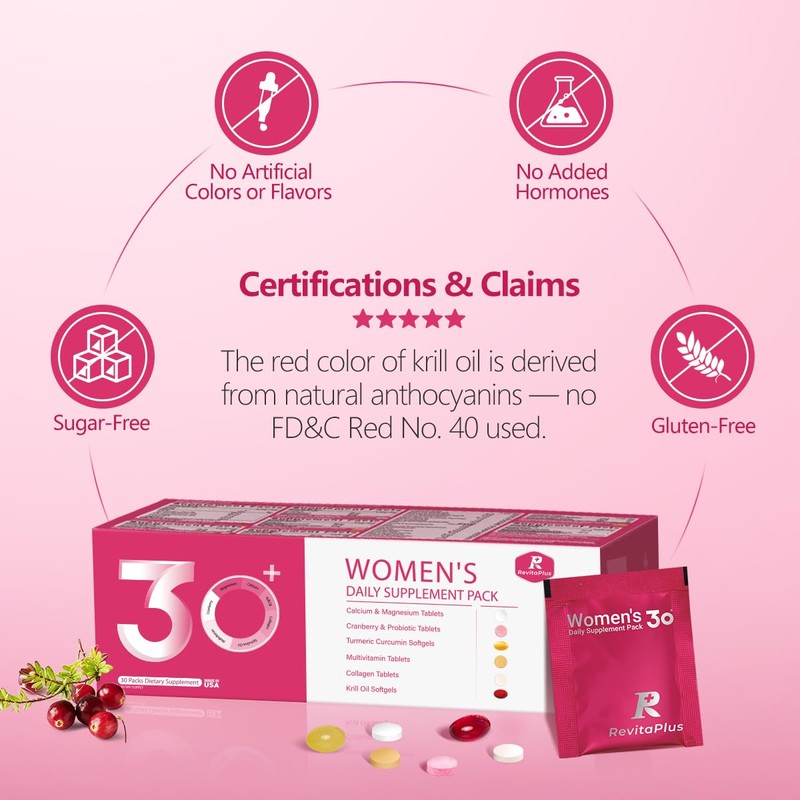 RevitaPlus Multivitamin for Women with Vitamin A,B,C,D3,E,K2,Biotin, Collagen,Krill Oil,Cranberries Supports Energy,Wellness,Beauty and Immune - Vitamin Packs for Women Health 30 Packs