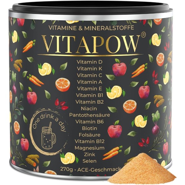 All 13 essential vitamins in one drink. Also contains the important minerals - magnesium, zinc, selenium. Supplemented by superfood powder - rosehip, turmeric, acerola cherry. Fruit powder - apple, orange, lemon. Vegetable P. powder - carcarcar. Beetroot fibre rich thanks to acacia fibre and inulin. Delicious ACE taste (orange, carrot, lemon). Made in Germany - laboratory-tested. High raw material quality - no added sugar, vegan, gluten-free and lactose-free. Easy to use - multi-powder in 25. 0 ml water on 0 ml Release