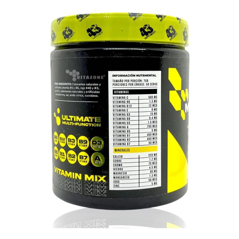 El Multivit+Min Sabor Naranja 350 gr 50 serv 43 Supplements es un producto de la reconocida marca 43 Supplements, especializada en la creación de suplementos nutricionales de alta calidad. Este multivitamínico en polvo, con un delicioso sabor a naranja, es fácil de consumir y se disuelve rápidamente en agua fría. Cada bote contiene 350 gramos del producto, lo que equivale a 50 porciones de 7 gramos cada una. A pesar de su sabor, este producto no contiene lactosa y es libre de gluten, lo que lo hace ideal para personas con dietas restrictivas. Sin embargo, no es apto para personas en período de lactancia o embarazo, ni para veganos. Los ingredientes incluyen colorantes naturales y artificiales, saborizantes, maltodextrina, sucralosa y ácido cítrico. Este producto no es un medicamento, y su consumo es responsabilidad de quien lo usa y de quien lo recomienda. Se recomienda para personas mayores de 18 años. Recuerda, la salud es lo más importante, consume responsablemente.