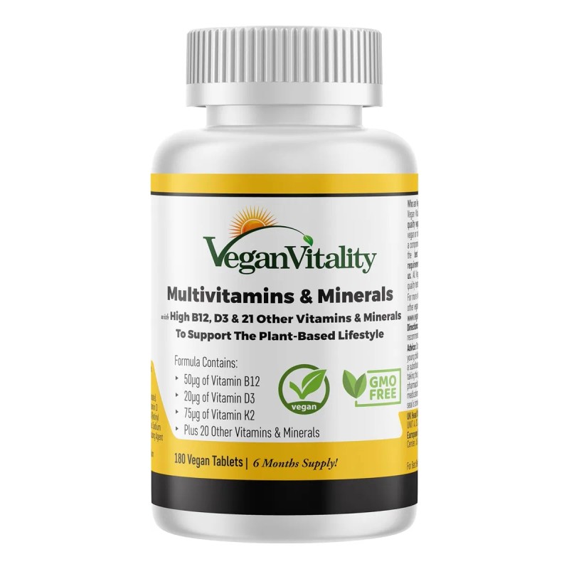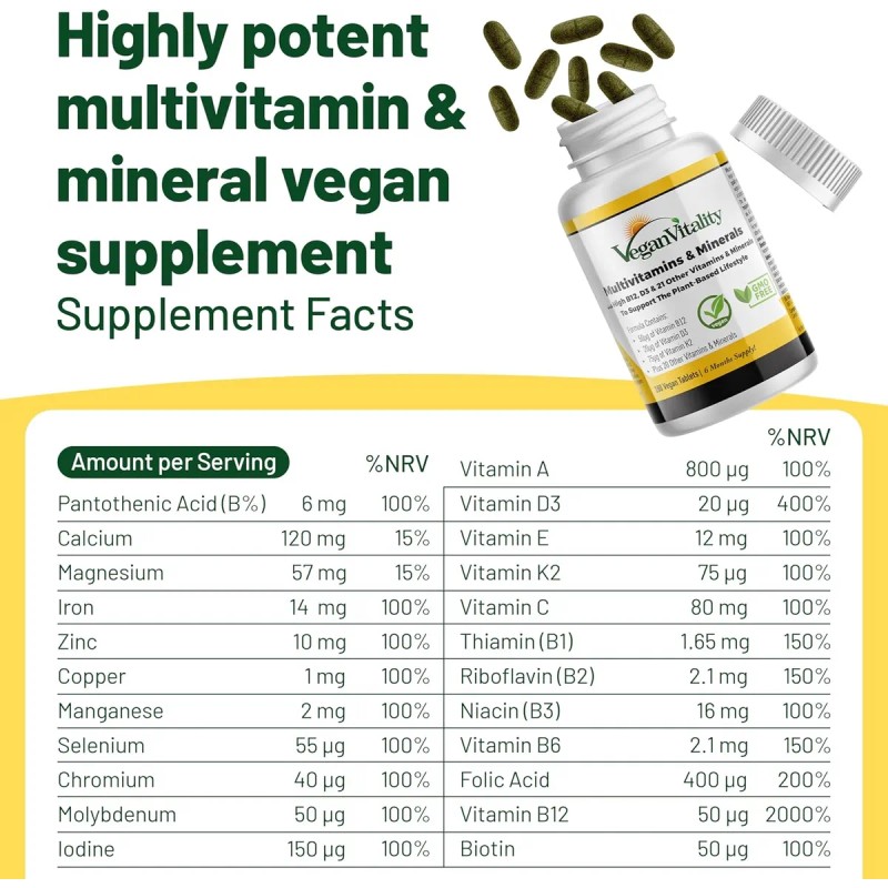 La vitamina vegana más vendida de Europa de Vegan Vitality con nuestra fórmula de alta resistencia y alta calidad contiene 50 ug de vitamina B12, 20 ug de D3, 75 ug de K2 más una dosis alta de otras 20 vitaminas y minerales. Más de lo que encontrarás en cualquier otro suplemento vegano multivitamínico.