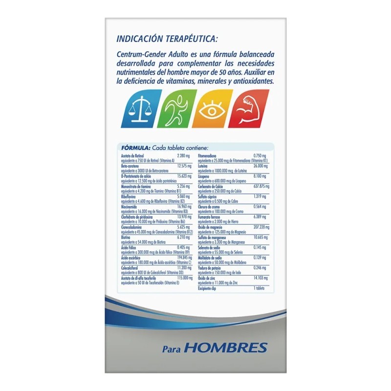 Multivitamínico completo diseñado para las necesidades nutricionales del hombre, con vitaminas y minerales que ayudan a mantener la energía diaria, la salud del sistema inmunológico, la función muscular y ósea. Ideal para hombres activos que buscan un soporte nutricional completo y confiable.