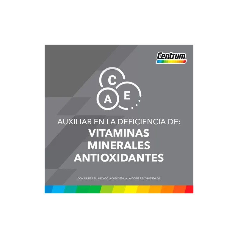 Auxiliar en las deficiencias de vitaminas, minerales y antioxidantes en los estados de desgaste como son: cansancio, fatiga, baja concentración, retención mental y salud visual. Favorece la transformación de energía a partir de los alimentos. Ayuda a reforzar las defensas del organismo. Indicado para la deficiencia de los componentes de la fórmula, para adultos mayores de 50 años.