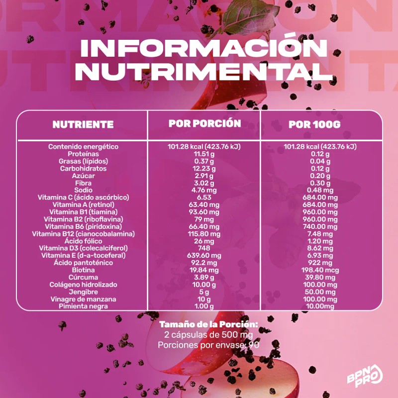 También Contribuye a una mejor salud y apariencia del cabello uñas y piel por el colágeno, calcio y cúrcuma.
