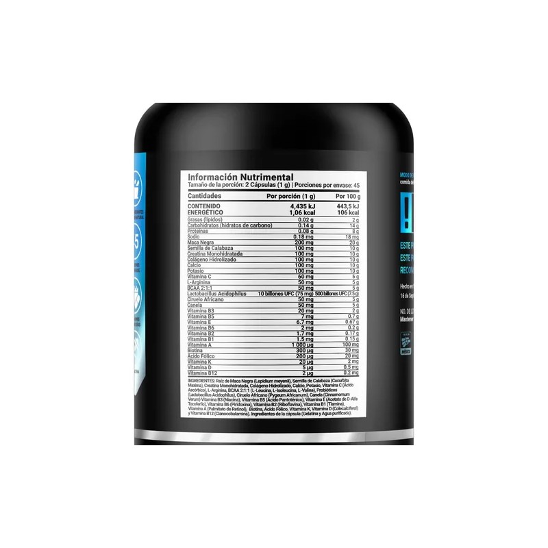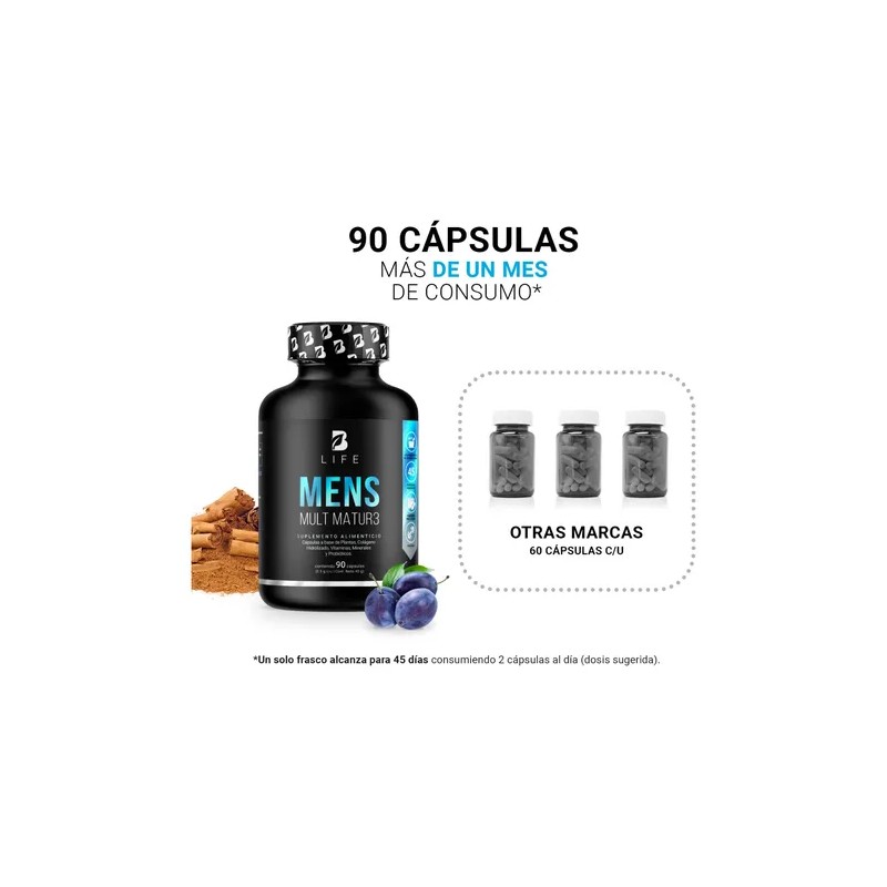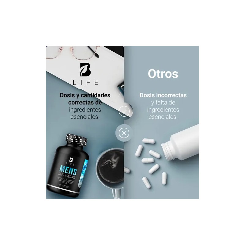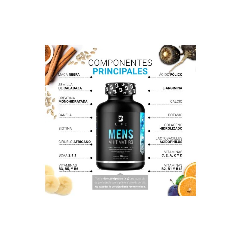 Descripción Limpia: ¡Mens Mult Matur3 B Life, tu fuerza y vitalidad! Cada cápsula de 500 mg contiene nuestra fórmula excepcional que fusiona Maca negra, Semilla de Calabaza, Creatina Monohidratada, Colágeno Hidrolizado, Calcio, Potasio, y un completo espectro de vitaminas: C, B3, B5, B12, E, B6, B2, B1, A, K y D. Además, incorporamos ingredientes clave como L-Arginina, BCAA 2:1:1, Lactobacillus Acidophilus, Ciruelo Africano, Canela, Biotina y Ácido Fólico, a diferencia de otras presentaciones que carecen de esta valiosa sinergia de ingredientes valiosos para el hombre maduro. Contiene 90 cápsulas.