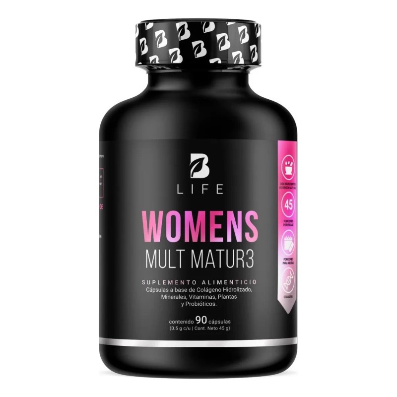 Descripción Limpia: ¡Disfruta la formulación de Womens Mult Matur3 B Life! Cada cápsula de 500 mg está diseñada a base de Colágeno Hidrolizado, Calcio, Inositol, Maca, Potasio, Lactobacillus, Ñame Silvestre, Canela, Biotina, Ácido Fólico y un complejo de Vitaminas esenciales para la mujer madura. Cada bote contiene 90 cápsulas.
