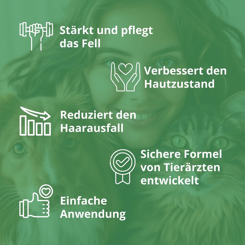 - Areas of application: especially suitable for matte, stressed coat, itching, skin irritation or to support coat change.
