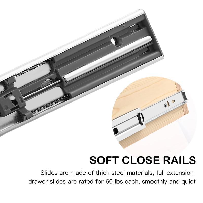 - SOFT CLOSE: The rails of the slide-out cabinet organizer are made of soft-close slides with full extension. Each drawer slide is rated for 60 lbs, providing a smooth and quiet operation.