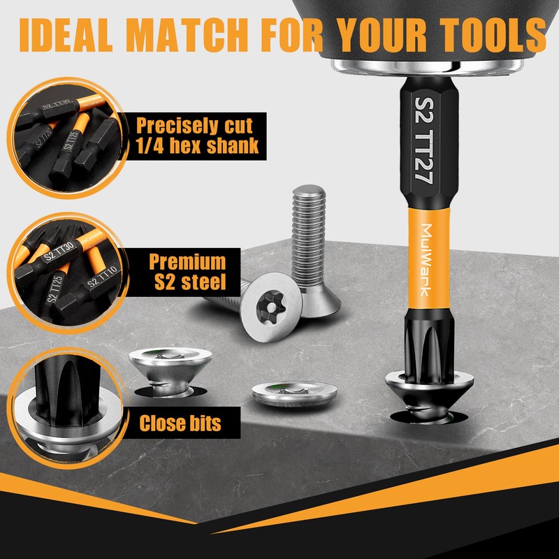 - COMPREHENSIVE SECURITY TORX BIT SET: Unleash the power of this 27-piece tamper-proof torx bit set, including 2” torx bits (T5-TT40) and 1” tamper proof torx bits with holes for ultimate precision