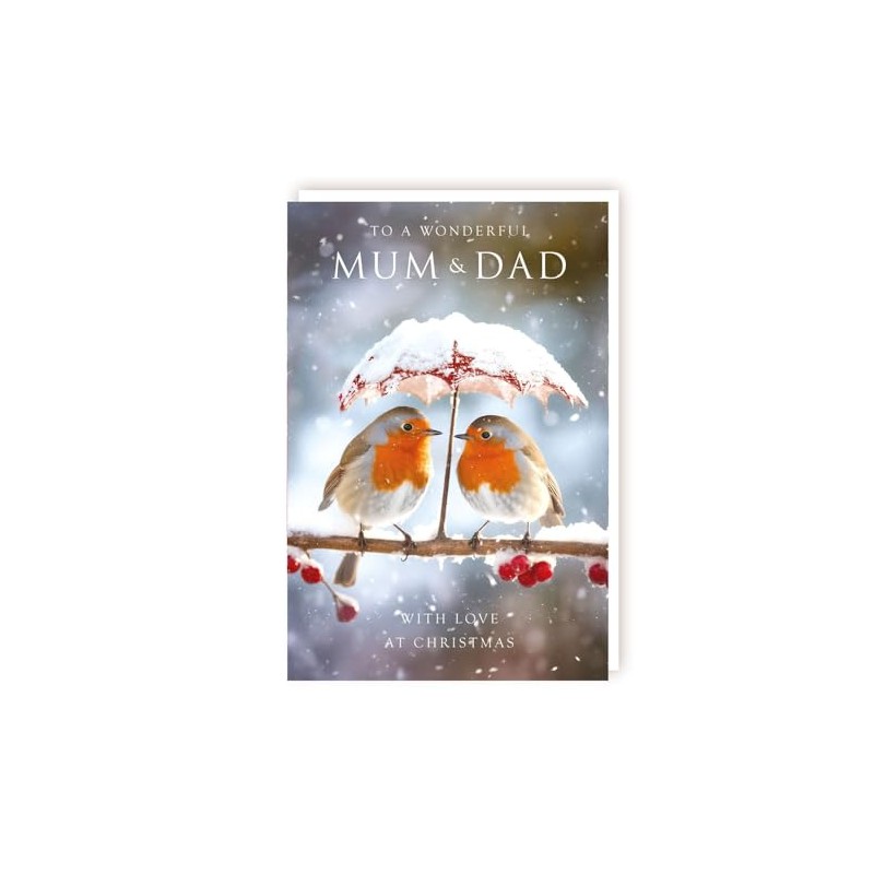 - 🎁 FESTIVE DESIGN: A delightful card featuring a photographic design of two robins underneath an umbrella sheltering from the snow, with the message "To a wonderful Mum & Dad - with love at Christmas" on the front. This card is supplied with a coordinating envelope.