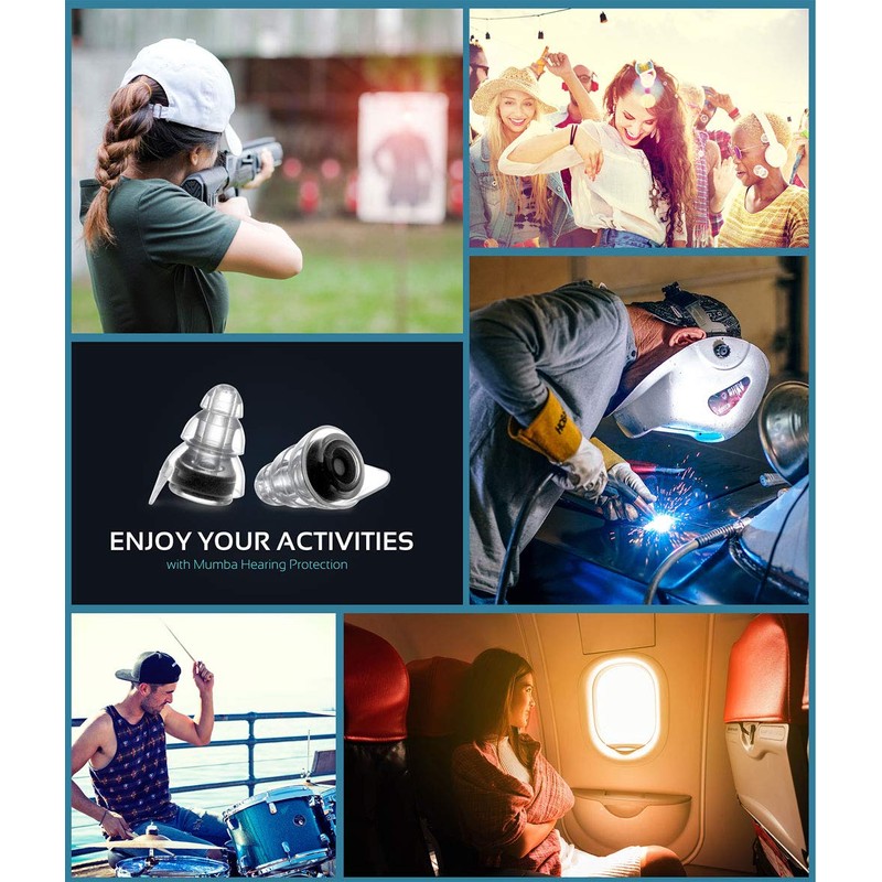 - ADVANCED FILTER TECHNOLOGY reduces noise (up to 24dB,NRR)evenly to maintain the full spectrum of sound while protecting hearing. Mumba concert earplugs deliver crisp, clear sound at a safe volume. Wont muffle music or voices as foam plugs do. Suitable for Concerts, Musicians, Drummer, Percussion, DJs