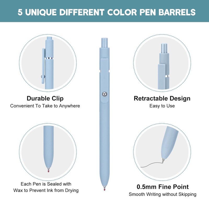 • Aesthetic ballpoint pens: discover the elegance and versatility of our pastel gel ballpoint pens. This set contains five retractable ink pens in assorted pastel colours with a fine 0.5mm tip.