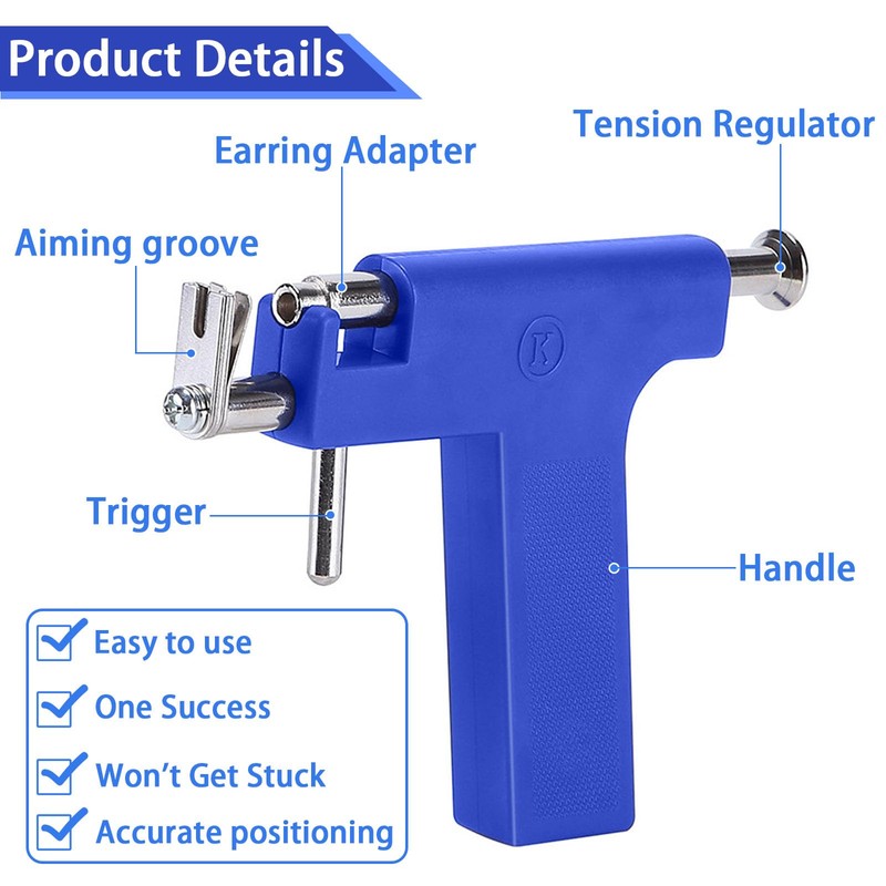 • Easy to use: the piercing gun is designed for easy holding and precise piercing accuracy. Simply align it to the part you want to be pierced, gently press the trigger and the piercing will pierce your ear.