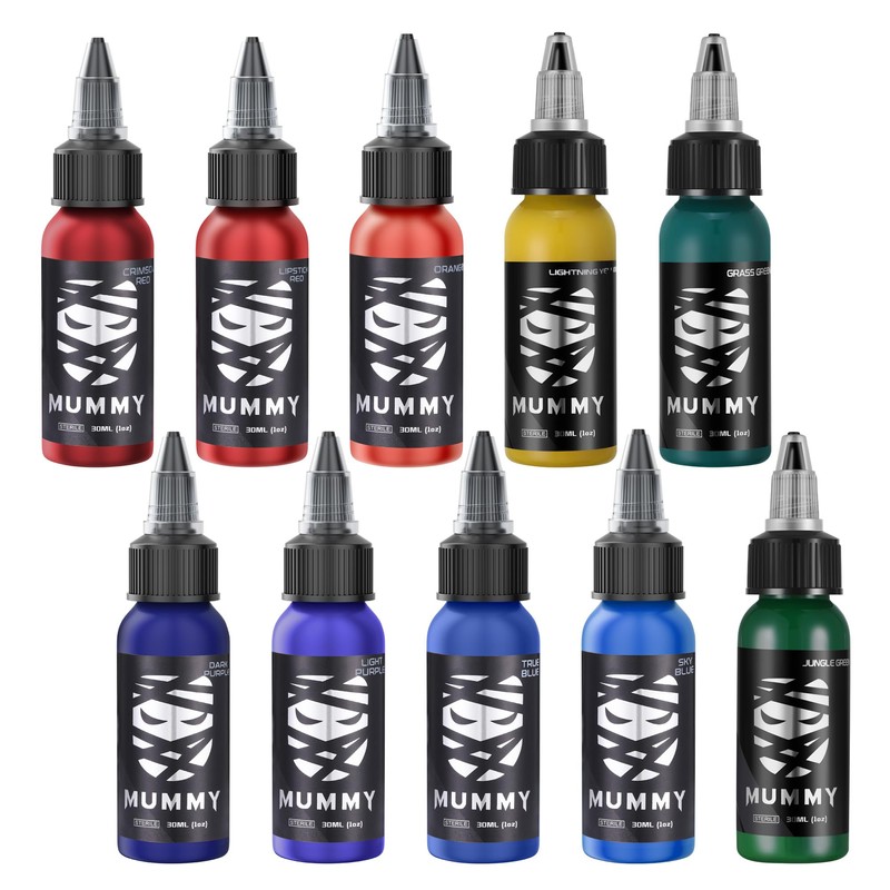 - Ingredient: Mummy tattoo inks use proprietary blend of natural pigments,vegetable glycerin,distilled water,hamamelis & isopropyl alcohol, all pigments derived from natural ingredients avoid allergies, skin rejection, and carcinogenicity. Precise blending ratio and proper fluidity can ensure that the pigment can be effectively injected every time it is pierced, increasing the coloring effect, reducing skin damage and better color retention.