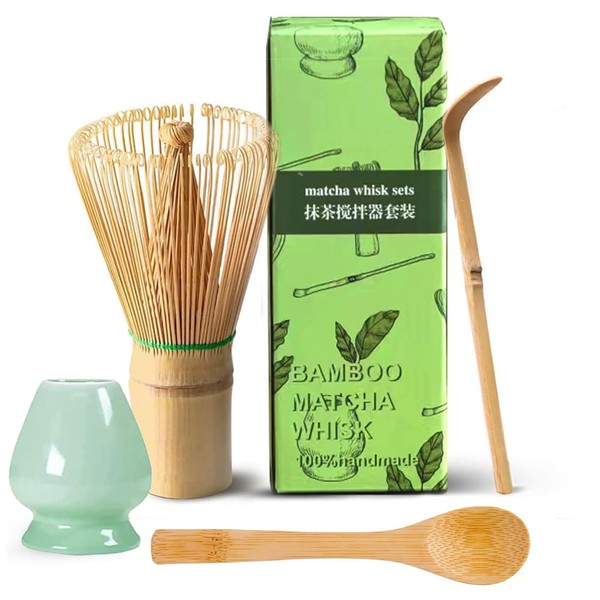• HANDCRAFTED BAMBOO MATCHA WHISK SET: This set includes a beautiful golden bamboo whisk, ceramic whisk holder, and tea scoop, all crafted by skilled artisans for the perfect traditional matcha tea drinking experience.
