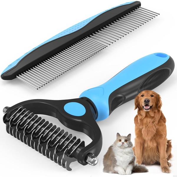 Mumoo Bear Pet Grooming Combo - Blue Deshedding Brush with Metal Comb for Det...