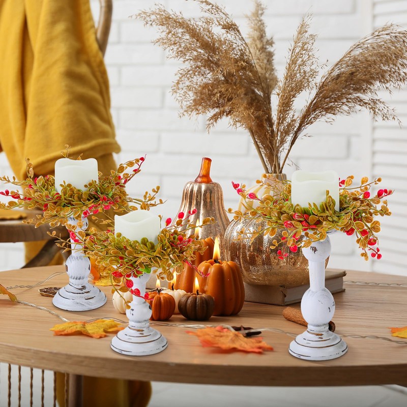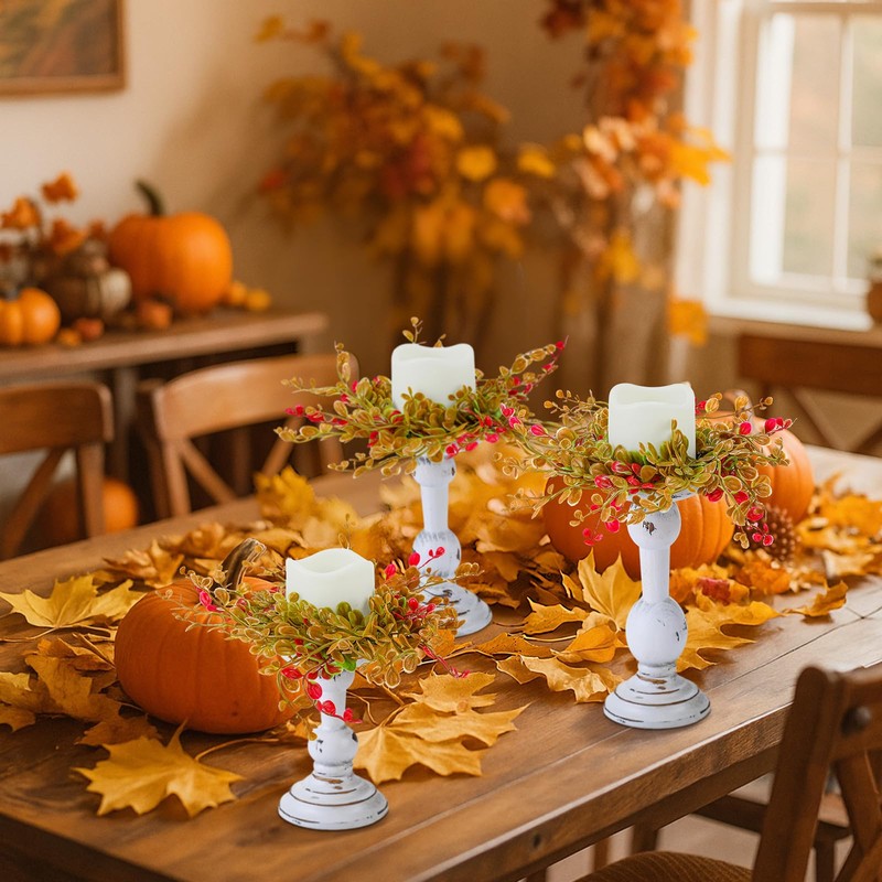 - Complete Package: this package includes 3 set fall candle holders with wreath; The complete fall table centerpieces set ensures a cohesive and stylish decor, allowing you to effortlessly adorn your space with a coordinated look that radiates charm and warmth; This product is only suitable for electronic candles
