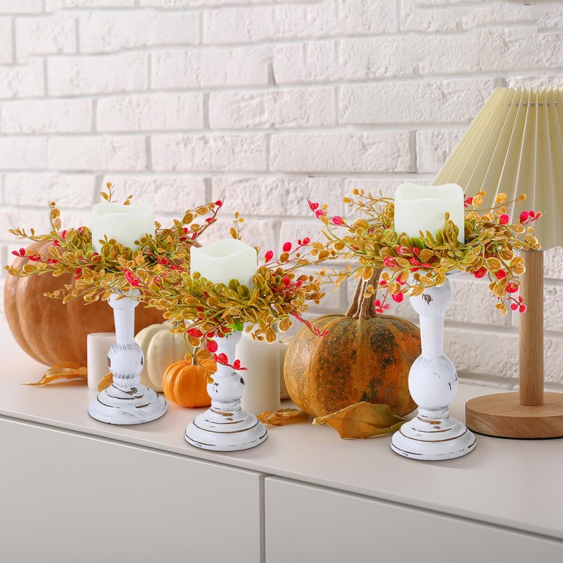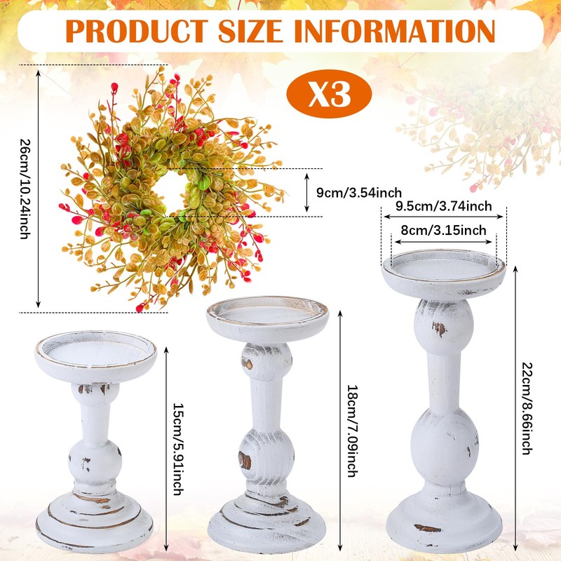 - Versatile Design: this fall farmhouse candle wreath ring includes candle holders in heights of approximately 6, 7, and 8.66 inches (15, 18, and 22 cm), and can accommodate pillar candles up to 3 inches in diameter; Paired with a colorful fall wreath, it's easy to add a touch of fall to your dining table or mantel