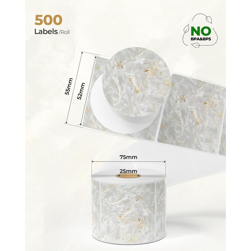 • Specifications: 500 shell labels/roll, paper roll diameter: 1 inch (25 mm) perfect with the label holder, actual printable size: 2 inches (50 mm x 50 mm), printer setting size: 2.09 x 2.09 inches (53 mm x 53 mm). No ink or ribbon is required for printing, saving costs and reducing trouble