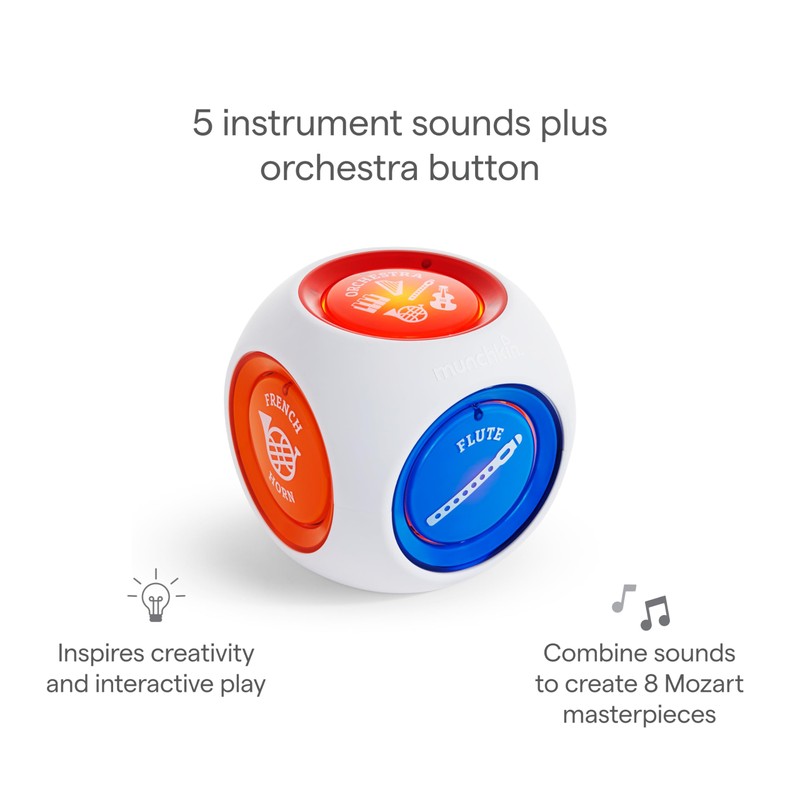At one point or another, every parent has experienced a particularly loud and headache-inducing toddler toy. But believe it or not, there are toys that make beautiful music too. Perfect for all ages, Munchkin's Mozart Magic Cube inspires creativity and interactive play while teaching how sounds combine to create eight classical music masterpieces by the master composer. With a touch of a button, this interactive cube lets your child add or subtract from any combination of five different instruments, including harp, French horn, piano, flute and violin. Each selected instrument button flashes to the tempo of the music. An orchestra button even plays all the instruments at once. Two volume levels let you choose the right level of sound. The Magic Mozart Cube provides a fun musical foundation for your little one. And that's music to your ears - in more ways than one. Requires three AA batteries (included).