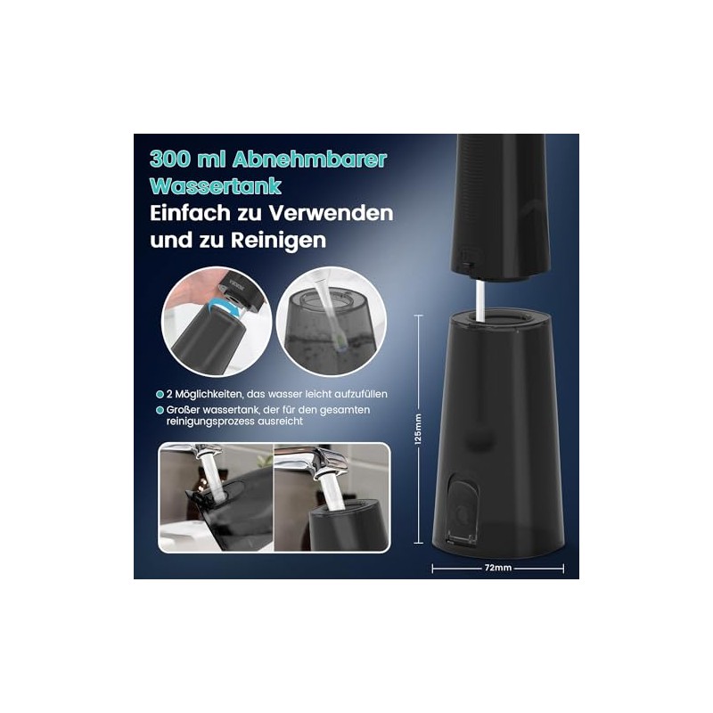 • üíé„Äê300ml Wassertank & IPX7 Wasserdichtigkeit„ÄëDer abnehmbare 300ml-Wassertank mit der Schwerkraftkugel sorgt f√ºr ausreichend und unterbrechungsfreie Mundhygiene. 2 Einf√ºllm√∂glichkeiten mit gro√üer √ñffnung f√ºr einfaches Ausgie√üen und regelm√§√üige Reinigung zur Vermeidung von Wasserr√ºckst√§nden. Die Zahndusche Water Flosser aus lebensmittelechtem Material, IPX7 wasserdicht, waschbar, sodass Sie sich keine Sorgen machen m√ºssen, ass Wasser versch√ºttet wird dund im Badezimmer Unordnung entsteht.