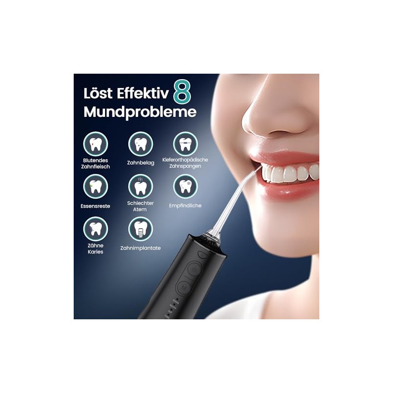 • üí¶„ÄêTiefenreinigen der Z√§hne & Schutz des Zahnfleisches„ÄëMunddusche verf√ºgt √ºber eine leistungsstarke Pumpe mit einem niedrigen Ger√§uschpegel von weniger als 55dB, eine Impulsfrequenz von 1400-1800 Mal/Min,einen Wasserdruck von 30-110 PSI, um einen kraftvollen und stabilen Wasserstrahl zu liefern, der reinigt tief in die Zahnzwischenr√§ume, Sekund√§rsch√§den an den Z√§hnen vermeiden. Entfernt effektiv 99,99% der Speisereste, um Ihren Atem frisch zu halten & Ihre Mundgesundheit zu verbessern.