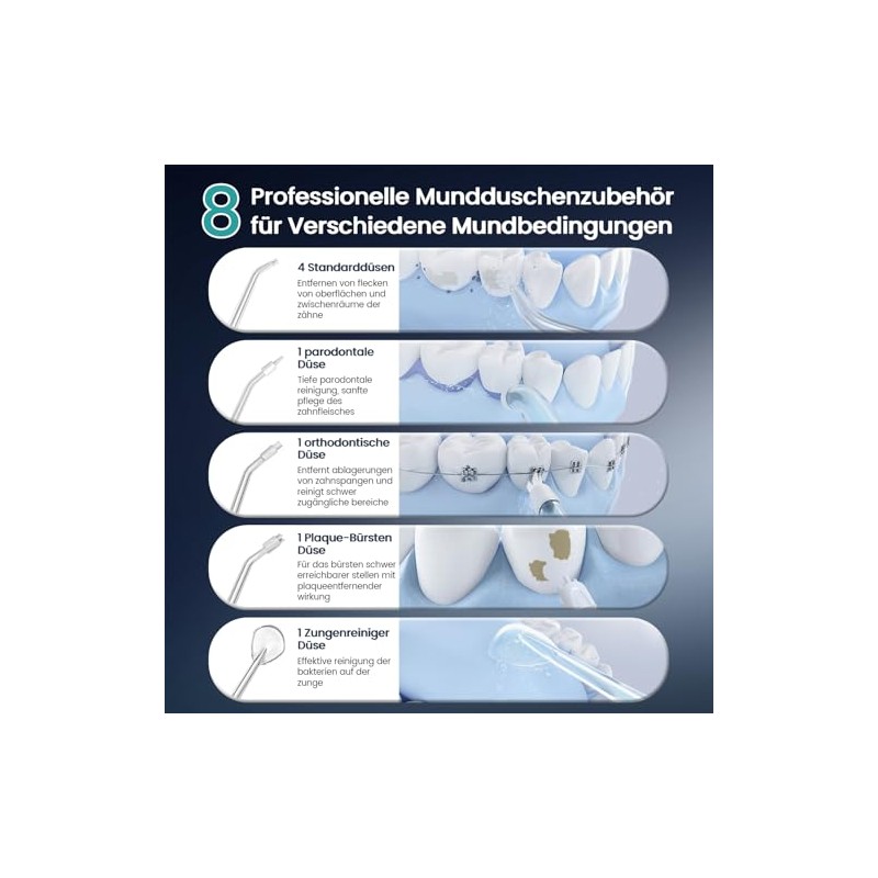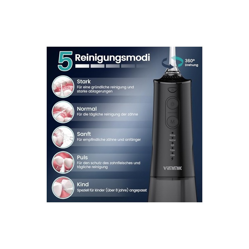 • üåä„Äê5 Modi & 8 Mundduschenzubeh√∂r„ÄëDie Kabellos Munddusche verf√ºgt √ºber 5 Modi (Stark, Normal, Weich, Puls, Kind).4 Standard-Spitzen, 1 Zungenreiniger-Spitze, 1 kieferorthop√§dische Spitze, 1 Plaque-Sucher Spitze und 1 Parodontal-Spitze erf√ºllen Ihre vielf√§ltigen Bed√ºrfnisse von der Standardreinigung bis zur Zahnfleischmassage. Mit der um 360 Grad drehbaren D√ºse k√∂nnen schwer zug√§ngliche Stellen problemlos mit dem elektrischen Zahnreiniger gereinigt werden.