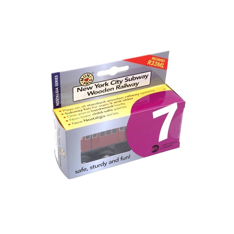 - Authentic Design: Faithful reproduction of the R33ML "Redbird" subway car from NYC's 7 line. High-Quality Construction: Made from solid hardwood for lasting durability. Child-Safe Materials: Finished with non-toxic, lead-free paints suitable for children aged 3 and above. Universal Compatibility: Works with all standard wooden railway systems, including popular brands. Educational Value: Encourages imaginative play while introducing children to urban transit history. Compact Size: Measures approximately 4.5" L x 1.25" W x 2" H, ideal for small hands.