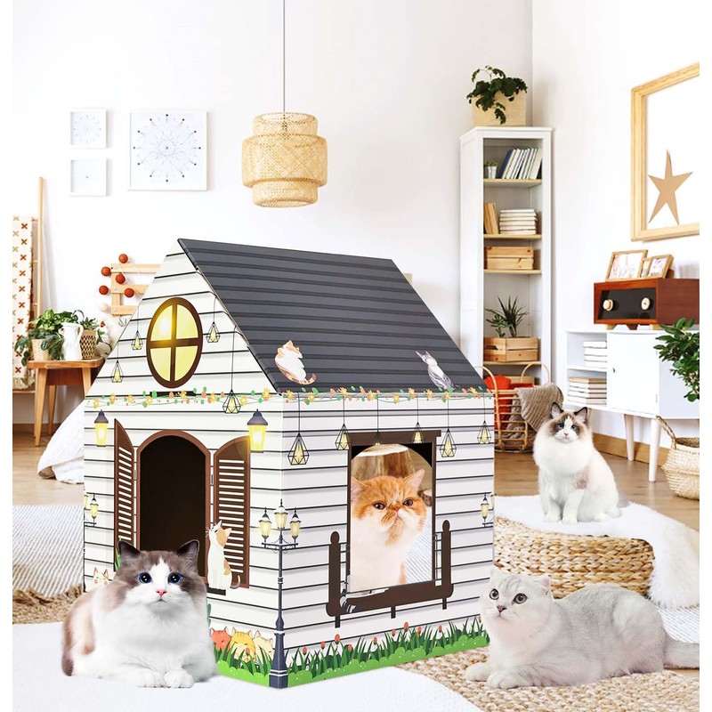 - Cardboard cat house: Cat scratcher house is made of cardboard, sturdy and stable enough to withstand your cat's daily use. Cat cardboard house is easy to assemble, with snap-on cardboard, you can have a exquisite and comfortable cat house in a few minutes