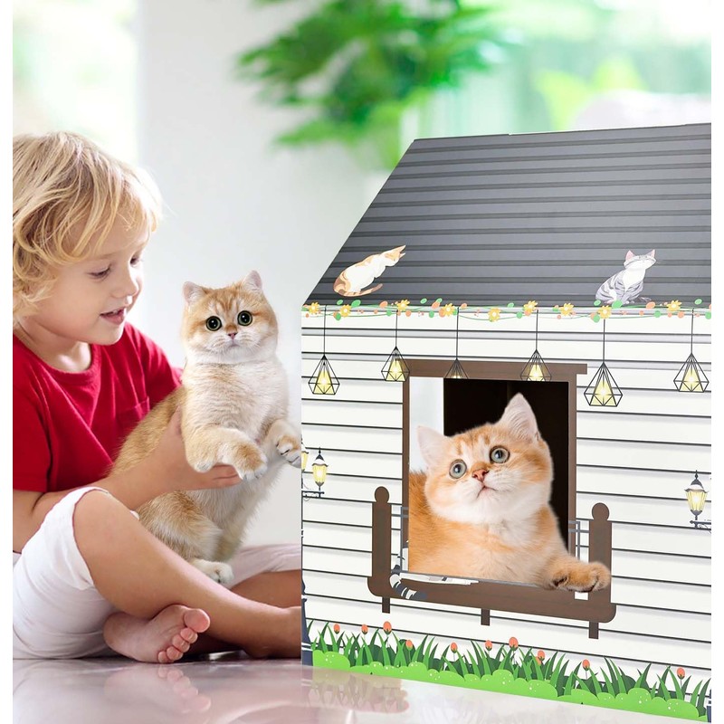 - Unique design: The cardboard cat house is cute and creative. The arch door is convenient for cat's enter and the windows are suitable for cat's look and play. The cute cartoon style and exquisite color match leave you a unique impression, adding a dreamy atmospher