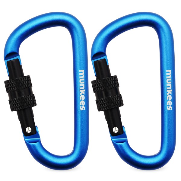 munkees 2-Pack D-Ring Carabiner with Lock , Caribeener Clips, Spring Snap Hook for Keychain, Aluminum D-Shaped Buckle (Large,2-Pack, Blue)