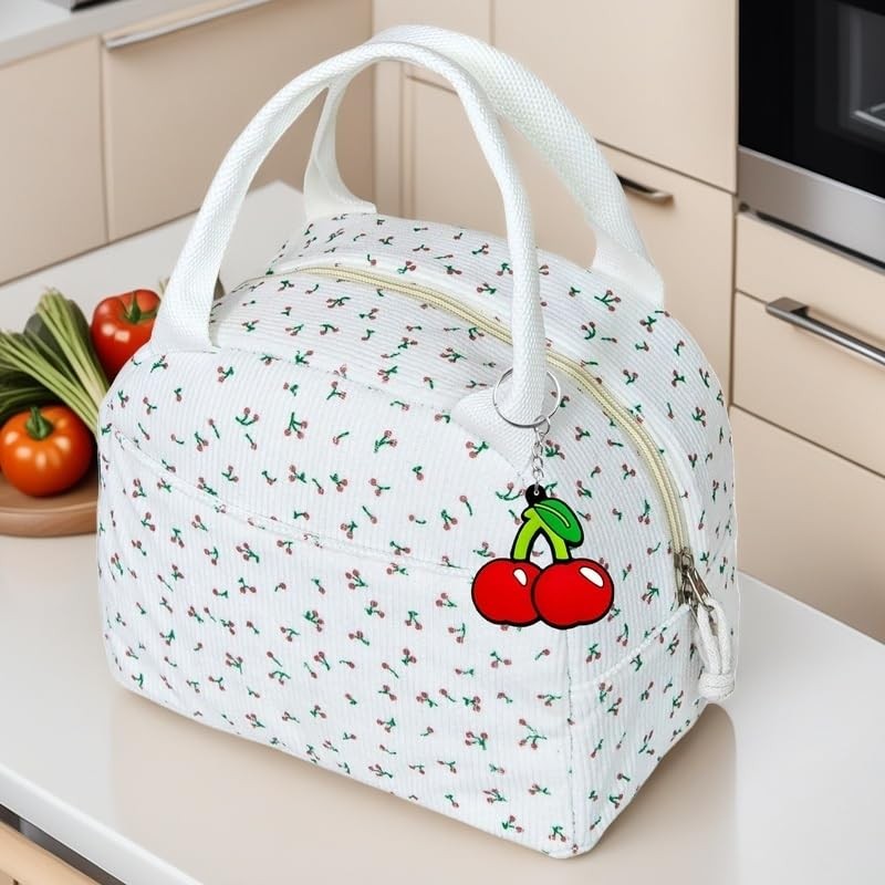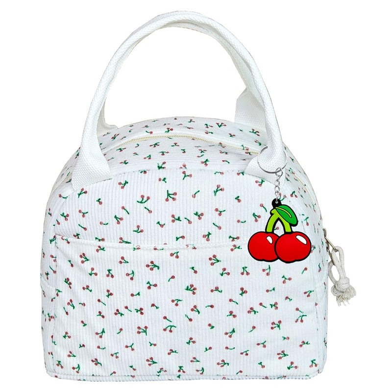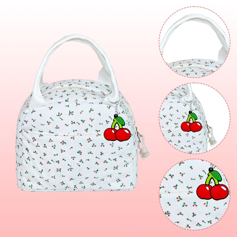 - Hervorragende Verarbeitung: Die isolierte Lunchtasche ist mit einem harten und glatten Handseil mit Hochdruck-Nähtechnologie genäht. Dadurch ist es sehr langlebig und nicht leicht zu reißen. Die äußere Schicht besteht aus Cordstoff mit einem schönen Kirschdruck, attraktiv für Kinder und Frauen. Es ist eine gut gestaltete Tasche für den langfristigen Gebrauch.