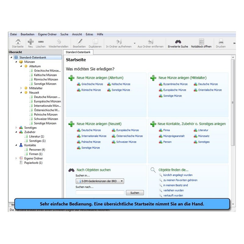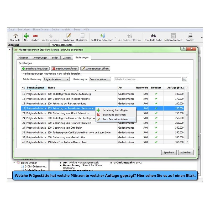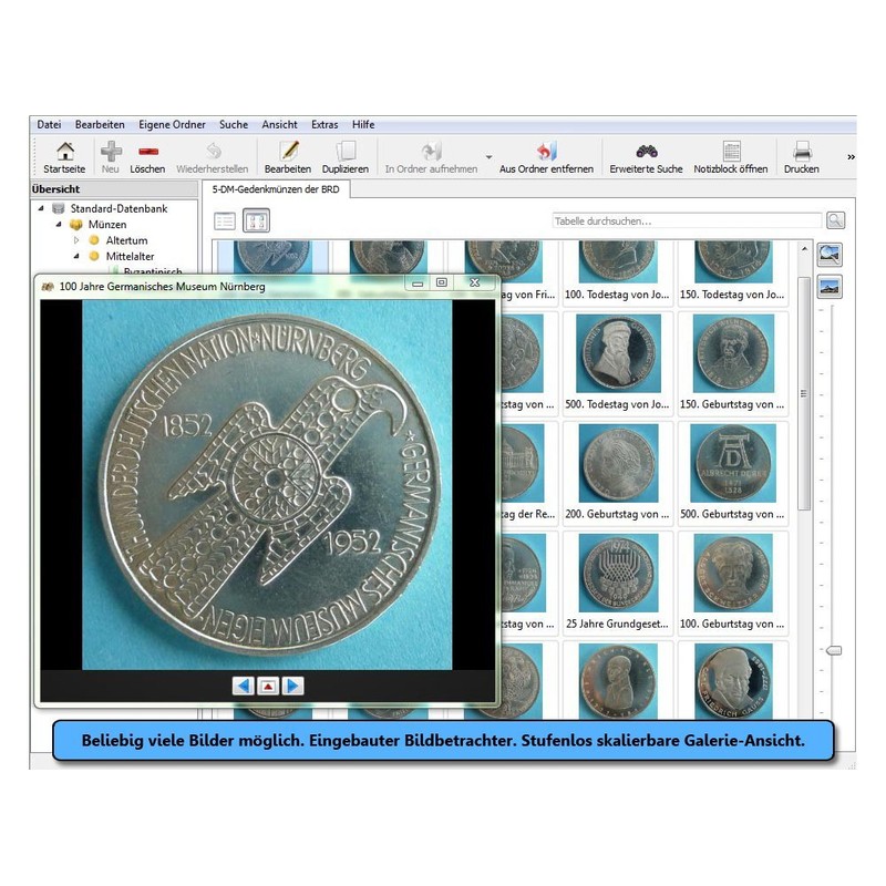 With this software, you can manage your entire coin collection. You keep an eye on costs and sales revenues, generate reports, overviews and statistics. You can even determine the value and value of your collection directly, create photo albums and much, much more.