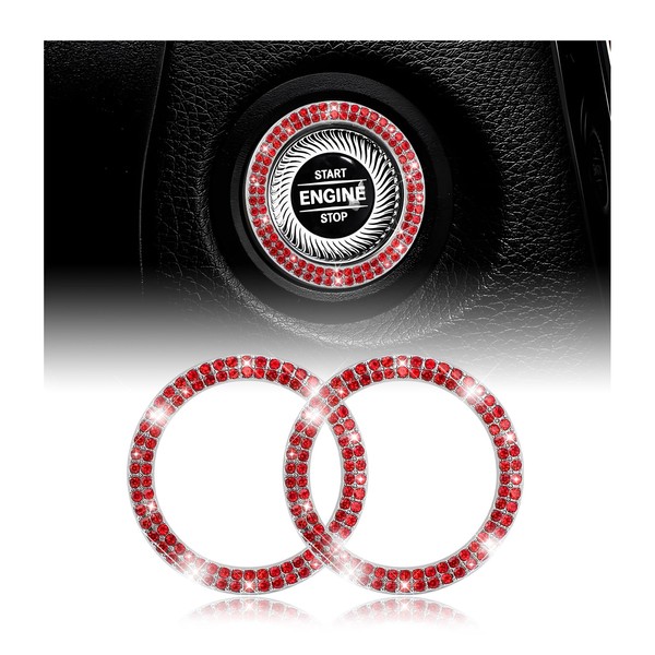MUQIDA 2PCS Bling Car Engine Start Stop Decoration Ring, Crystal Double Rhinestone Rings Push Start Button Sticker, Sparkling Key Ignition & Knob Ring Auto Interior Decor for Women(Red)