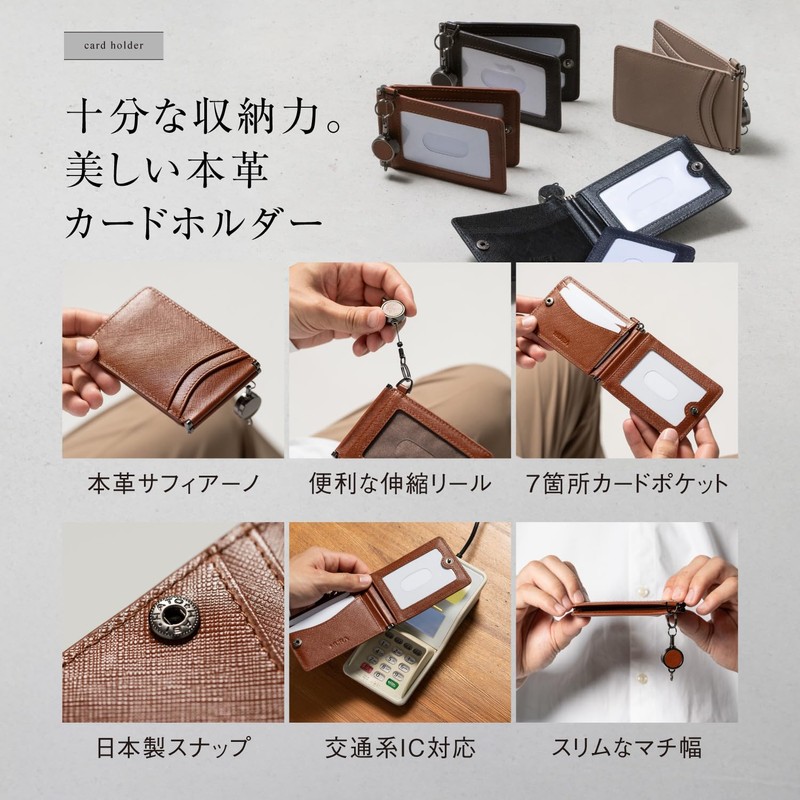 - (An excellent card case made of luxurious Saffiano leather with an elastic reel and excellent storage capacity) This card case uses saffiano leather that is resistant to scratches, water, and dirt. Comes with an elastic reel, so it is easy to touch just by pulling it out. It has clear window pockets and card pockets for excellent storage and functionality