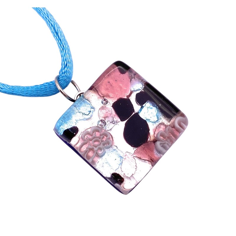 A genuine Murano Glass Pendant from Venice, Italy, with a silver leaf base. 2cm x 2cm and mounted on a 46cm (18") complimentary coloured silk cord necklace with a silver plated lobster clasp. 'Murano Glass' printed on the rear of the pendant. Includes a Certificate of Authenticity and packed in an attractive gift pouch.