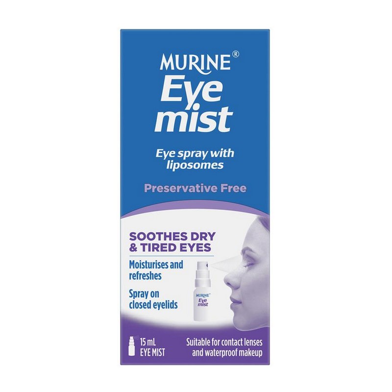 MURINE® Eye Mist restores and stabilises the natural tear film, reducing moisture loss. MURINE® Eye mist applies liposome particles onto the closed eyelids that refresh and maintains the natural moisture in and around the eyes.