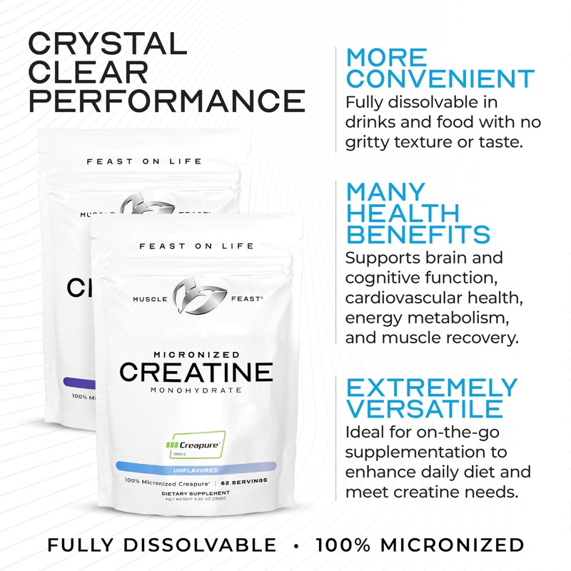 Muscle Feast Creapure - Micronized Creatine Monohydrate Powder | Premium Pre-Workout or Post-Workout | Creatine for Women & Men | Easy to Mix, Vegan, Gluten-Free, Safe and Pure (Unflavored, 250g)