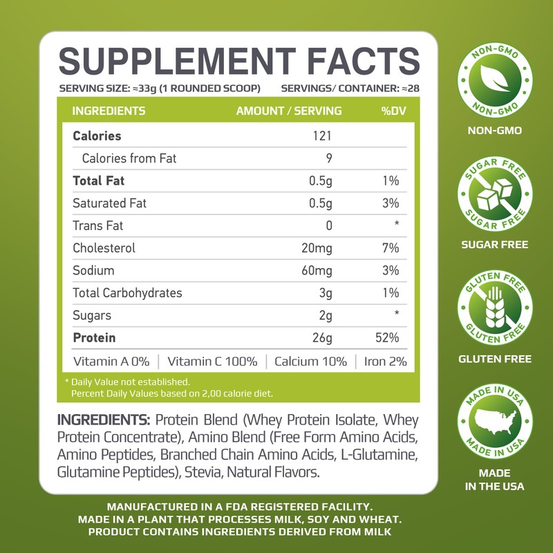 100% PURE LEAN MUSCLE PROTEIN MUSCLE WHEY PROTEIN is precisely formulated to help you grow, maintain and repair lean muscles. This is achieved through rapid absorption, which is accomplished by using the best possible amino acid profile and high-quality whey protein. We use premium quality un-denatured whey protein for its digestive properties and superior nutrient utilization. This formula delivers the core nutrients active bodies need to increase fitness levels and accelerate lean muscle development.