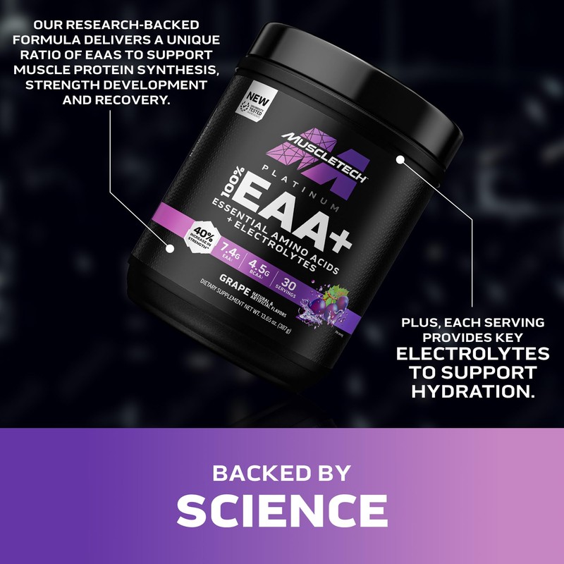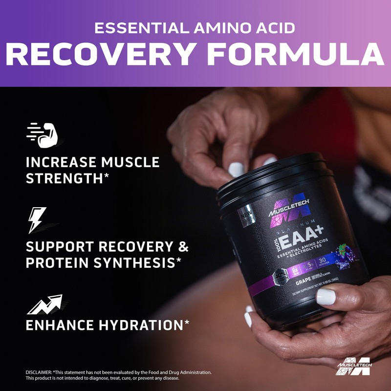 - Ultimate Recovery Backed by Science: MuscleTech Platinum 100% EAA+ is a workout essential. It delivers a unique ratio of essential amino acids (EAAs) to support muscle protein synthesis, strength development and recovery. Grape. 30 servings.