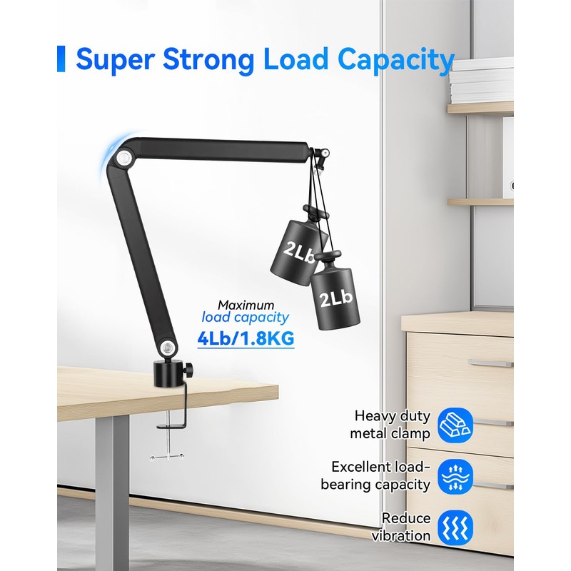 - 【Easy to Use & Compatibility】This cantilever metal microphone stand arm quickly mounts to the table with a user-friendly clamping mechanism and has a 3/8-inch bracket and 5/8-inch adapter that are compatible with most streaming and podcast microphones. Perfect for video recording, broadcasting, game streaming, online conferencing, etc. in any home or office environment.