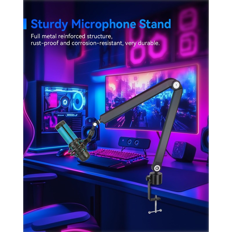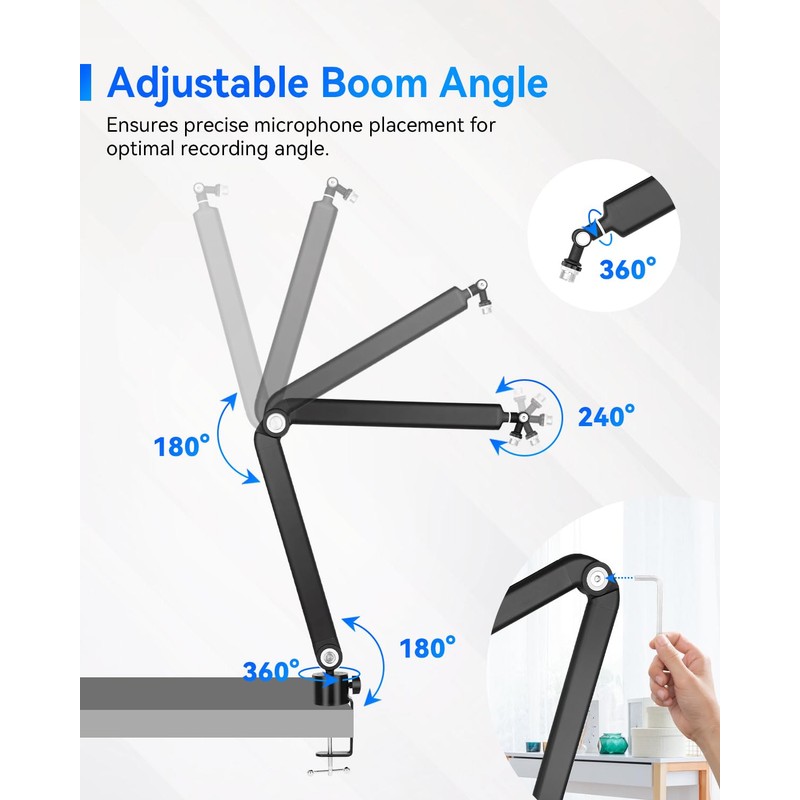 - 【Boom Microphone Stand】This professional Boom Arm Microphone stand can be adjusted to the right angle or height to display your voice after mounting the microphone on the stand. The low-profile design allows the boom to be placed behind or below the monitor, making the desktop wider and neater with an unobstructed view.