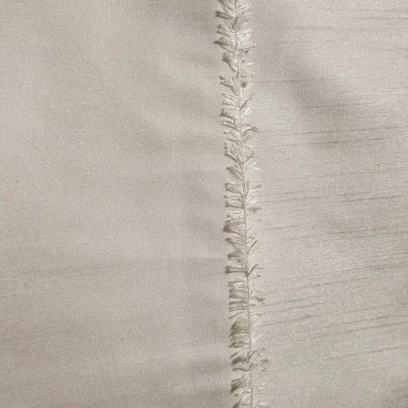 Dupioni fabric is a plain-woven fabric. Using a fine yard on the warp and an uneven yarn on the weft. This creates visual and textural raised thin stripes in the fabric. The thread used here has a subtle sheen to it. giving it a subtle color refracting iridescence.