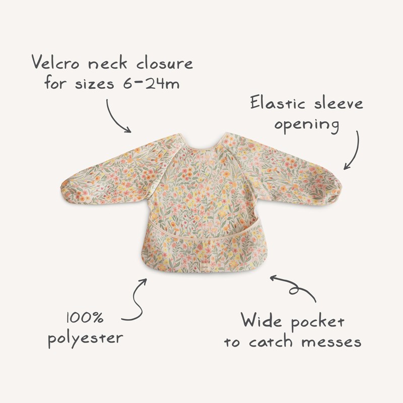 mushie Long Sleeve Baby Bib | Mess Free & Waterproof Fabric for Toddlers | Adjustable Fit for Ages 6-24 Months (Retro Flowers)
