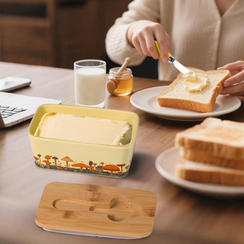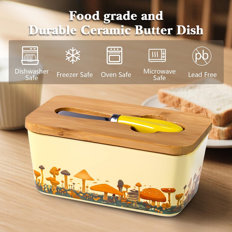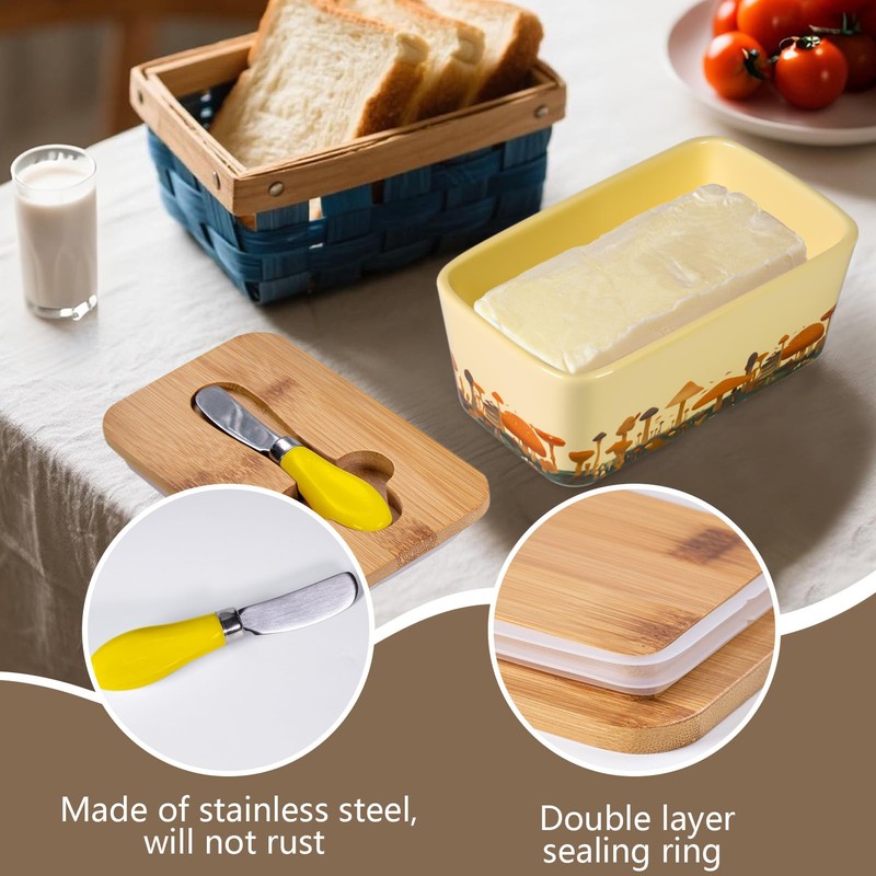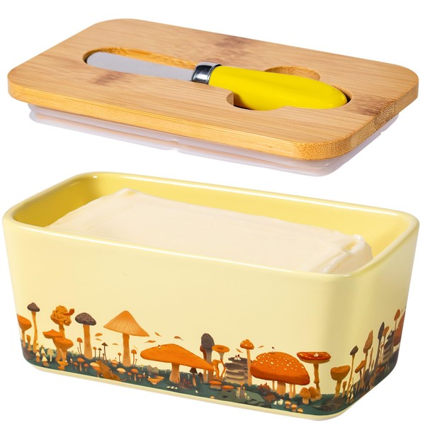 Mushroom Butter Dish with Lid,Large Butter Crock Keeper Saver,Ceramic Butter Container for Countertop with Highly Sealed Silicone Thick Wooden Lid for Kitchen Farmhouse Decor (Yellow, Mushroom)