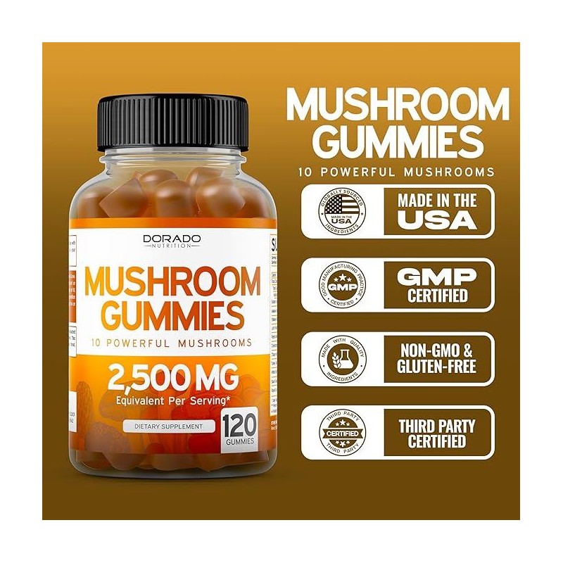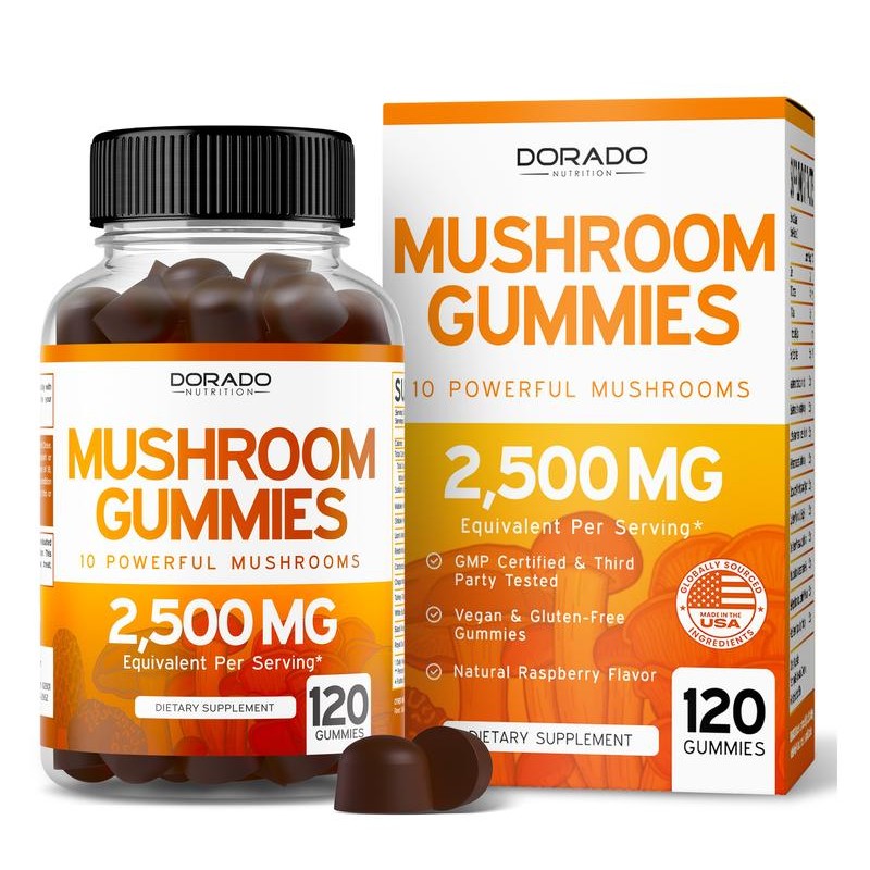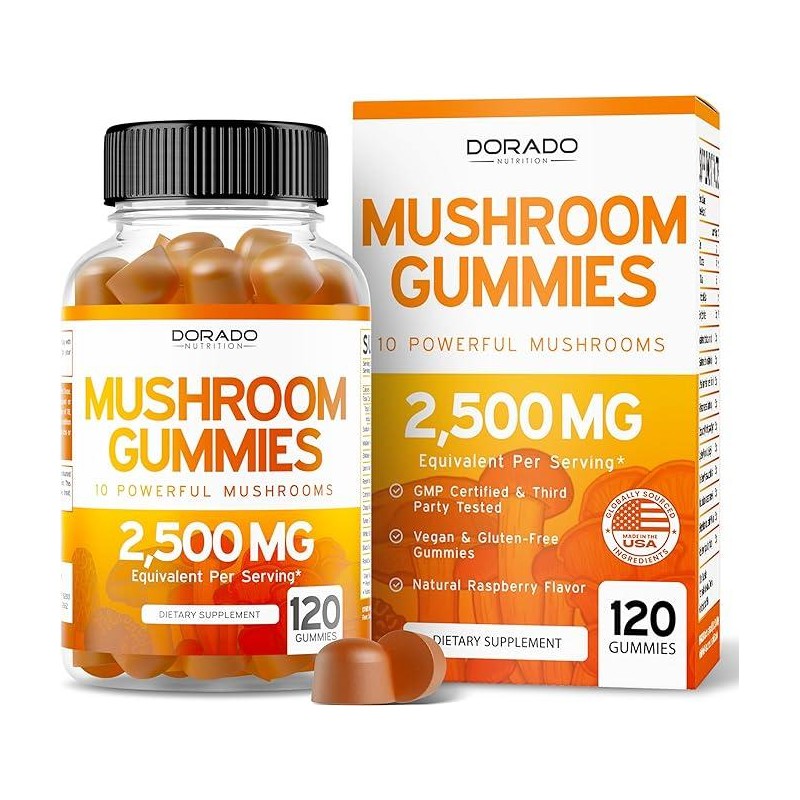 Boost your wellness routine with Dorado Nutrition Mushroom Gummies, a premium blend of 10 powerful mushrooms including Lion’s Mane, Chaga, Cordyceps, and Reishi. Each gummy is crafted to support brain health, metabolism, energy, and immune function while delivering maximum potency. With 2,500 mg extract equivalent per serving and 120 gummies per bottle, these delicious raspberry-flavored gummies make it easy and enjoyable to take your daily supplement. Made in the USA with high-quality, vegan, and organic ingredients, Dorado Nutrition Mushroom Gummies are lab-tested for purity and potency to ensure you get the best in mushroom supplementation.